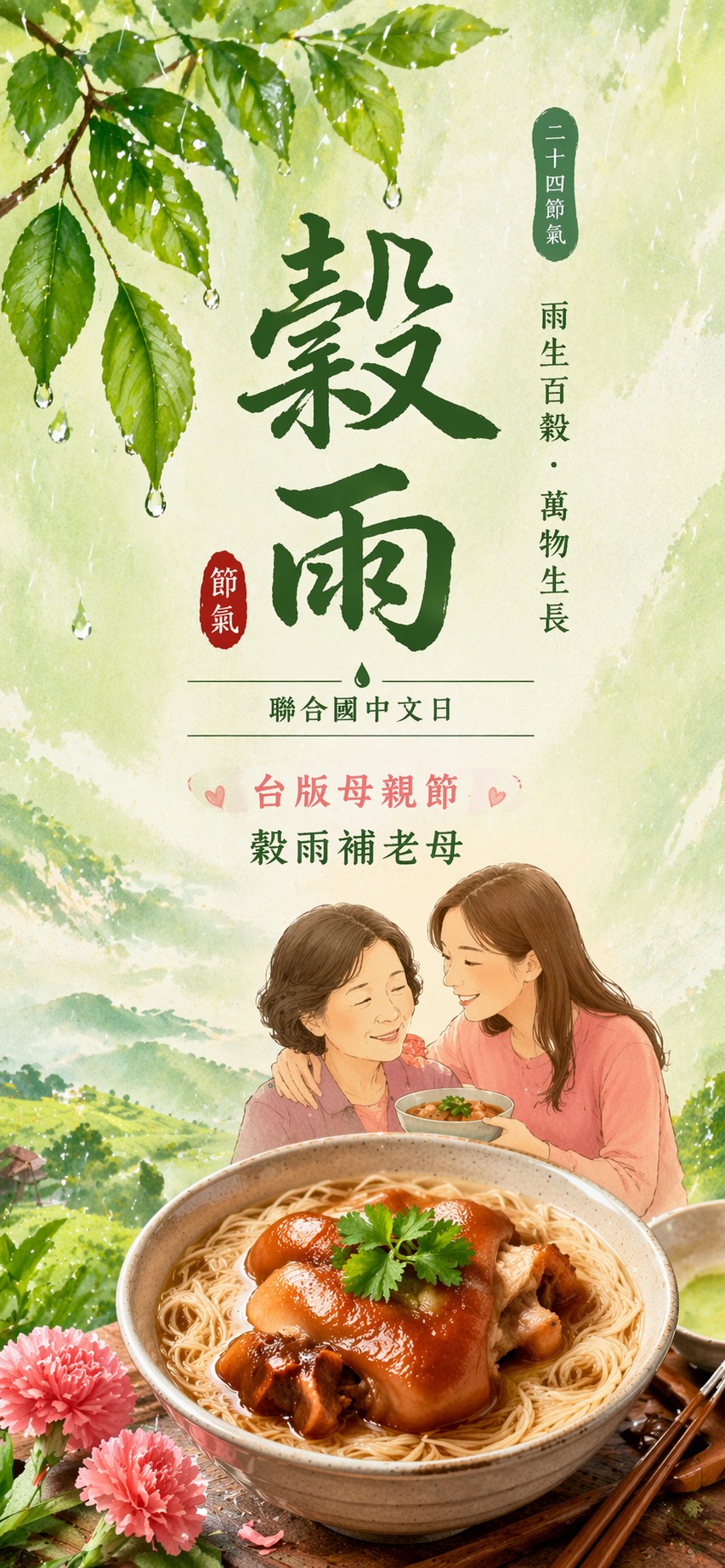 在臺灣,穀雨還有一個很有人情味的習俗,叫做「穀雨補老母」。出嫁的女兒會在這段時間回娘家,帶豬腳和麵線給母親進補。豬腳象徵健康強壯,麵線代表長壽,用簡單的一餐,表達對母親的關心與感謝,因此也被稱為「台版母親節」。